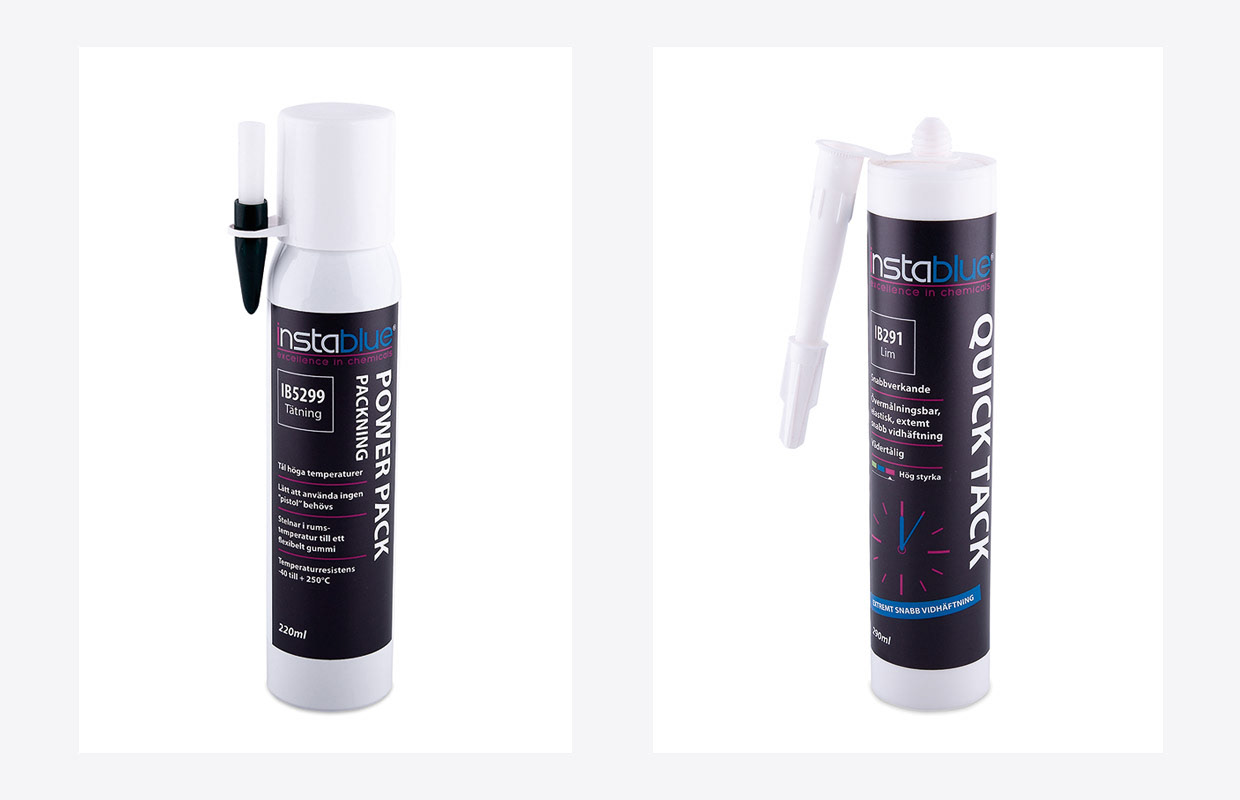 Produktetiketter för Instablue. C.a 20 st olika innehållsförpackningar i olika format. Översatta i norska, danska, finska.